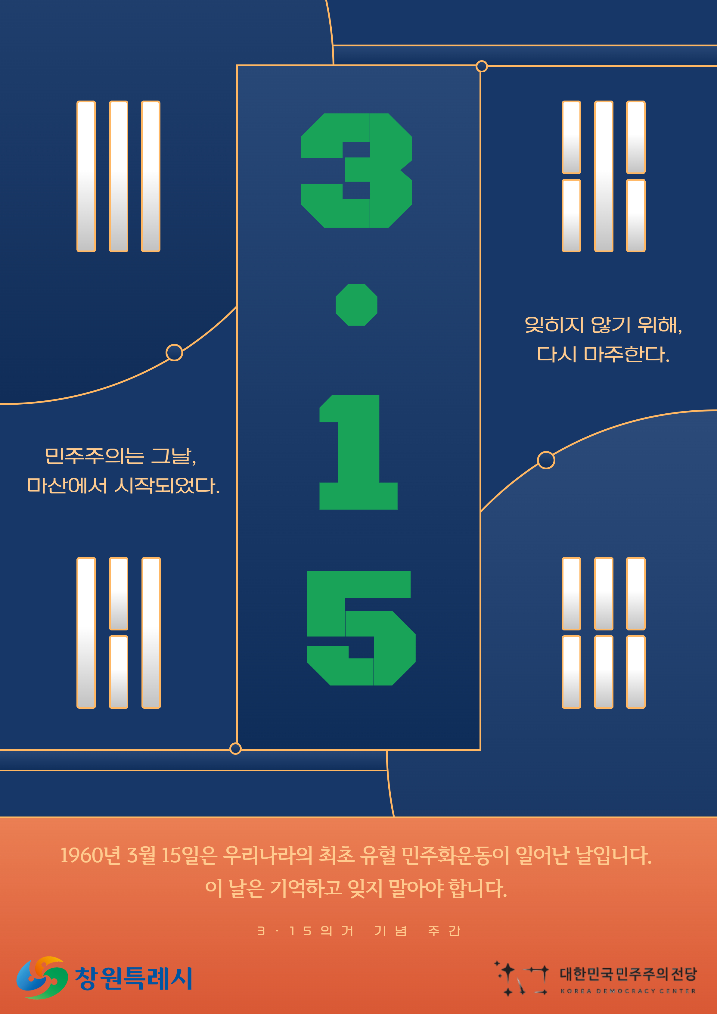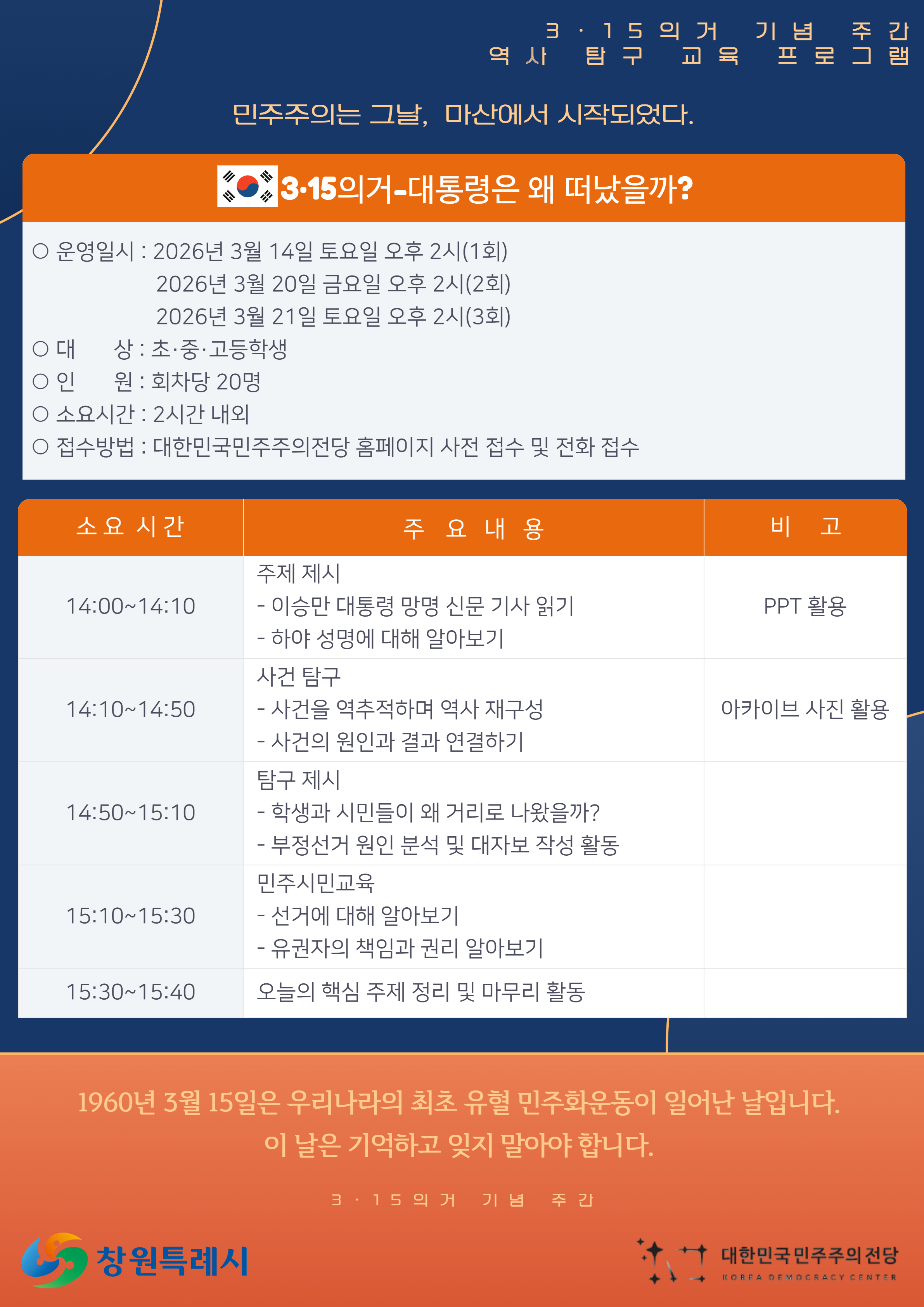 < 프 로 그 램 개 요 > ○ 프로그램 : 3·15의거-「대통령은 왜 떠났을까?」 ○ 운영일시 : 2026년 3월 14일 토요일 오후 2시(1회) 2026년 3월 20일 금요일 오후 2시(2회) 2026년 3월 21일 토요일 오후 2시(3회) ○ 운영대상 : 초·중·고등학생 ○ 운영장소 : 대한민국민주주의전당 2층 교육회의실(창원시 마산합포구 소재) ○ 활동내용 : 3·15의거 역사탐구 교육※ 홈페이지에서 확인 가능 ○ 접수방법 : 대한민국민주주의전당 홈페이지 사전접수 및 전화접수 ○ 신청기간 :각 회차 전까지(정원 마감 시 조기 마감) ○ 문 의 : 대한민국민주주의전당 055-225-7068 |