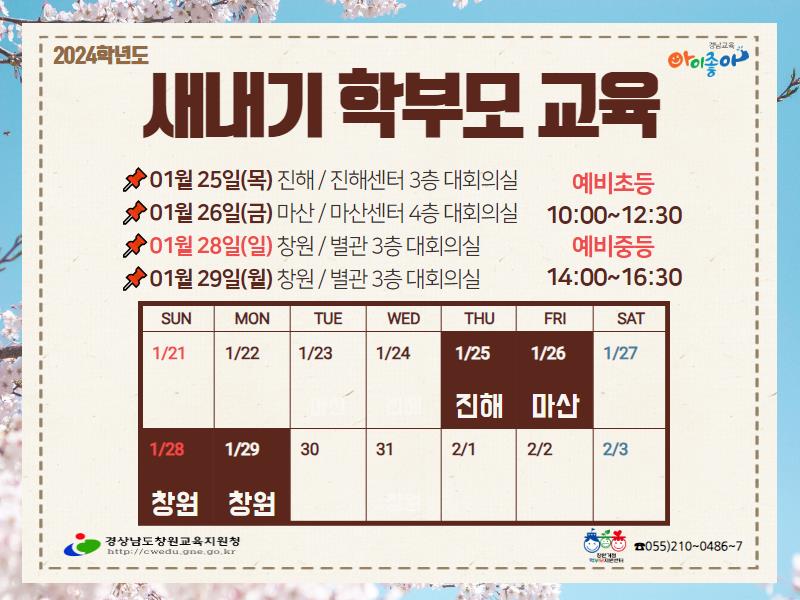 <창원거점 학부모지원센터 새내기 초, 중학교 학부모 교육 안내> 2024학년도 초등학교 입학, 중학교 진학을 앞둔 새내기 학부모들의 걱정되는 마음은 같습니다. 창원교육지원청 창원거점 학부모지원센터에서 현직 선생님에게 학교생활에 관해 이야기를 듣고 질의하는 시간을 마련했습니다. 2024학년도 새내기 초, 중학교 학부모님들의 많은 참여 바랍니다. * 신청기간: ▶ 2023. 12. 27.(수)~2024. 1. 14.(일) * 신청방법: ▶ http://pf.kakao.com/_xmxgxkpj/103400799 / 회차별 60명 선착순 모집(대기자 10명 포함, 총70명) * 자세한사항은 위에 주소에 접속하여 확인해주시기 바랍니다. 문의: 창원교육지원청 창원거점 학부모지원센터 ☎055)210-0486~7 |