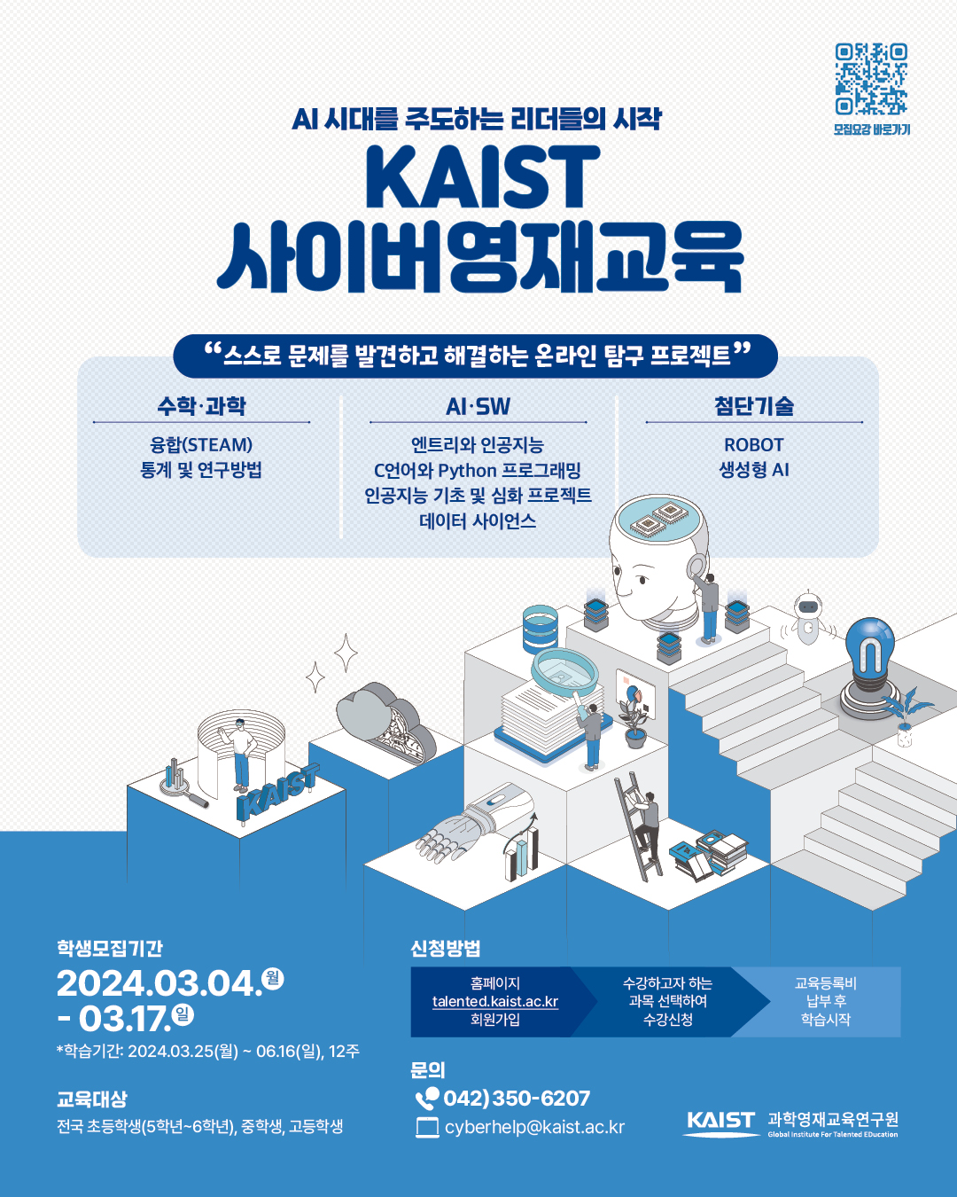 다. 학습방법 - KAIST 튜터와 함께하는 온라인 학습활동 - e-Book 혹은 동영상으로 개념을 학습하고 탐구 프로젝트 수행을 중심으로 한 자기주도학습 ※ 교육자료의 형태(e-Book or 동영상)는 과정에 따라 다를 수 있음 - 학습결과에 대한 개별 맞춤형 피드백 제공 라. 수강신청 및 학습기간 안내 1) 수강신청 및 등록비 납부: 2024년 3월 4일(월)~3월 17일(일) 2) 학습기간: 2024년 3월 25일(월) ~ 6월 16일(일), 총 12주 회원가입 | | 수강신청 (교육비 납입) | | 학습시작 | KAIST 사이버영재교육 홈페이지(talented.kaist.ac.kr) 접속 후 회원가입 |