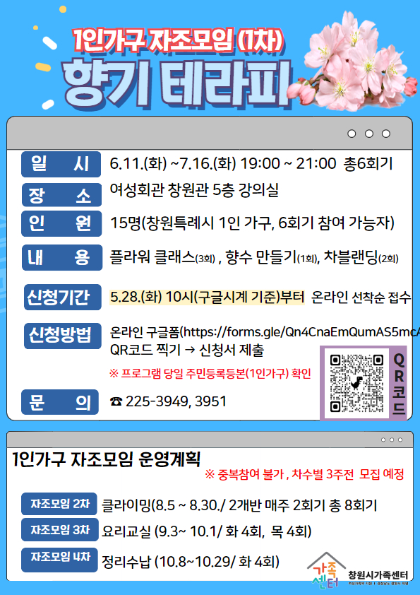 프로그램 개요 가. 일 정: 2024. 6.11.~ 7.16.(매주 화) 19:00 ~ 21:00 총 6회기 나. 장 소: 여성회관 창원관 강의실(5층) 다. 인 원: 15명(창원특례시 거주 1인가구) ※ 6회기 필참 라. 내 용: 향기 테라피(플라워클래스,향수만들기,차 블랜딩) 마. 신청기간: 5. 28.(화) 10시(구글시간 기준)부터 온라인 선착순 접수 바. 신청방법: 온라인 구글폼(https://forms.gle/Qn4CnaEmQumAS5mcA) ※프로그램 당일 주민등록등본(1인가구) 확인 사. 문 의: 여성가족과 창원시가족센터(☎ 225-3949, 3951)