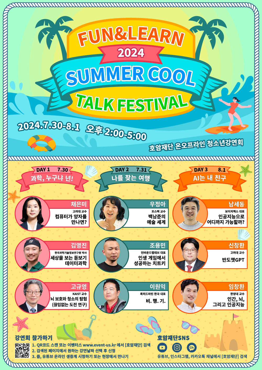 당 재단은 국내외 최고 전문가들의 강연을 통해서 전국의 청소년들에게 최신 과학 및 인문 지식을 배우고 장래 진로에 대한 탐구의 기회를 제공하고자 합니다. - 아 래 - 가. 행사 개요 □ 행사명 : Fun and Learn, 2024 Summer Cool Talk Festival □ 일 시 : 2024. 7.30 ~ 8. 1(3일간), 14:00 ~ 17:00 □ 강연자 : 국내외 저명 명사(9명) □ 주 제 : 과학, 누구냐 넌(1일차), 나를 찾는 여행(2일차), AI는 내 친구(3일차) □ 참 여 : 실시간 온라인 참여(줌 및 유튜브 시청) 또는 현장 참여 □ 주 최 : 호암재단(www.hoamfoundation.org)
