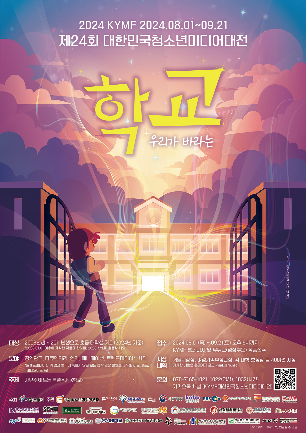 서울특별시가 주최하고 시립청소년미디어센터가 주관하며 여성가족부와 푸른나무재단이 후원하는 <제24회 KYMF대한민국청소년미디어대전>은 국내 최대 규모의 청소년 미디어 축제입니다. 본 행사는 청소년의 창의적 상상력을 발휘할 수 있도록 지원하고 건전한 콘텐츠 문화를 보급하고자 총 6개 영역의 영상/사진 작품을 공모하고 우수작품을 발굴하여 시상합니다. 올해는 <학교>를 특별주제로 선정하여, 청소년이 ‘바라는 학교’의 모습이 담긴 작품으로 세상과 소통하는 기회를 마련하고자 합니다. 가. 행 사 명 :제24회 KYMF대한민국청소년미디어대전 나. 주최주관 : 서울특별시 / 시립청소년미디어센터 다. 공모분야 :영상(공익광고, 다큐멘터리, 애니메이션, 영화, 트렌드미디어) / 사진 ※트렌드미디어란, 위 영상 범주에 속하지 않지만 스토리가 있는 영상(뮤직비디오, 숏폼, 미디어아트 등) 라. 주 제 :① 자유주제 / ② 특별주제 : 학교 (택 1) 마. 출품자격 : 2006년~2011년생으로 초등·대학생 제외(2024년 기준) ※ 2023.01.01 이후에 제작한 작품에 한하며, 2023 KYMF 출품작 제외 바. 시상내역 : 서울시장상, 여성가족부장관상, 대학총장상, 협회장상 등 40여편 사. 접수기간 :2024년 8월 1일(목) ~ 9월 21일(토) 오후 6시까지 아. 접수방법 : 온라인접수http://kymf.ssro.net 자. 시 상 식 : 2024년 11월 2일(토) / 서울특별시청 및 온라인 생중계 차. 본 행 사 : 2024년 10월 31일(목) ~ 11월 6일(수) / 서울시청, 청계천 광교갤러리, 시립청소년미디어센터 등 - 수상작 상영 및 전시, 관객과의 대화, 전문 심사위원과의 네트워크 파티 등 카. 관련학과 :미디어/영상/광고/애니메이션/사진/신문방송/연극영화/콘텐츠학과 등 타. 비 고 : 한국예술종합대학교 영상원 영상예술특기자 전형 인정 대회 파. 문 의 : 미디어제작팀 070-7165-1021, 1022(영상), 1032(사진)