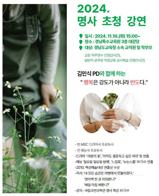 가. 연수 개요 1) 과정: 「2024. 명사 초청 강연회」 2) 일시: 2024.11.19.(화) 15:00~16:40 (등록 14:40~15:00) 3) 장소: 경상남도교육청 특수교육원 3층 대강당 4) 대상: 경상남도교육청 소속 교직원 및 학부모 300명 5) 주제: 김민식 PD와 함께 하는「행복은 강도가 아니라 빈도다」 6) 방법: 교원 직무연수 인정(2시간), 일반직공무원 직장교육 상시학습 인정(1시간)