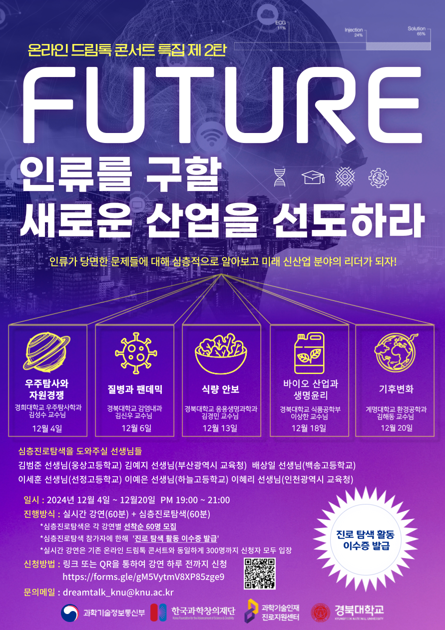 과학기술정보통신부와 우리 재단, 경북대학교는 미래인재들의 과학기술 분야 진로 지원을 위한 <온라인 드림톡 콘서트>를 개최하고 있습니다. 위와 관련하여, 행사 참여를 위한 신청 내용을 아래와 같이 안내드리니 많은 관심과 참여 바랍니다. 가. 프로그램 개요(※ 세부내용 붙임 안내 포스터 참고) 1) 프로그램명: 인류를 구할 새로운 산업을 선도하라 2) 일시/주제: 2024.12.4.(수) ~ 12.20.(금) 19~21시 / 신산업 분야 5개 주제 3) 내 용: 이공계 진로강연(60분), 심층 진로상담(60분) 4) 참여대상: 중·고등학생 등 5) 운영방식: 비대면 온라인 강연(Zoom) 및 소회의실 활용 심층 진로상담 ※ 진로 탐색 활동 이수증 발급 예정 나. 참여신청 1) 신청기간: 각 강연 1일 전까지 상시 신청 2) 신청방법: 온라인 신청(https://forms.gle/gM5VytmV8XP85zge9), 안내포스터 QR코드 참고 다. 문의: dreamtalk_knu@knu.ac.kr