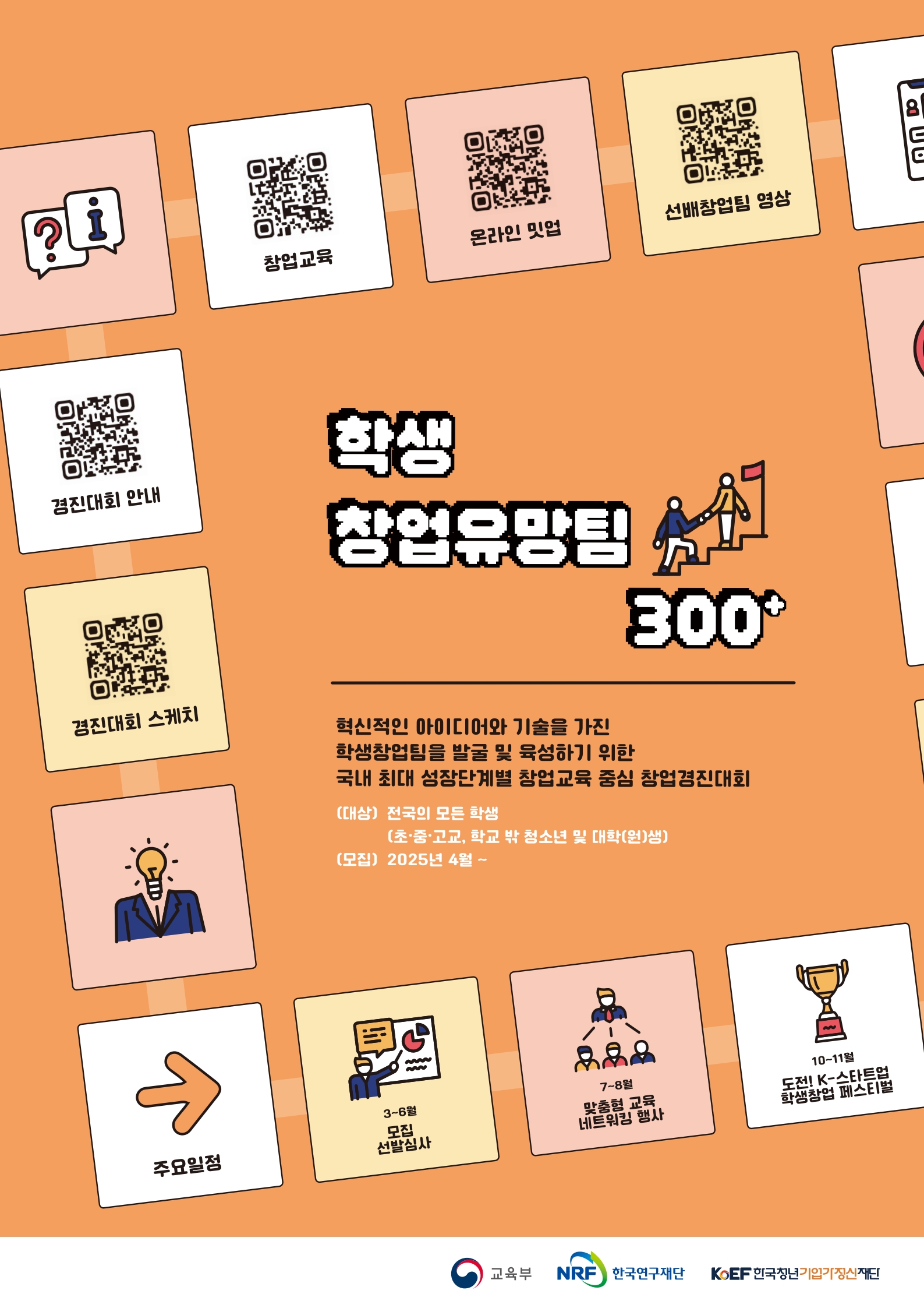 교육부는 창업에 열정이 있는 전국 학생들의 도전의식을 고취하고 창업에 대한국민적 인식개선 및 문화확산을 위해「2025 학생 창업유망팀 300+」를 붙임 같이 공고하니, 창업에 관심이 있는 학생들의 참여를 독려 바랍니다.